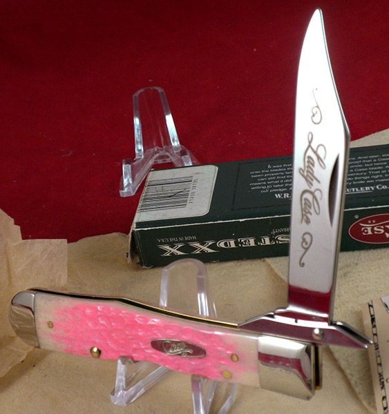 Pink Bubba Gum standard jigged bone and a single oval "Case _ xx" long tailed C script shield. This variation has a Lady Case etch and a serial number. 100 numbered knives were made.