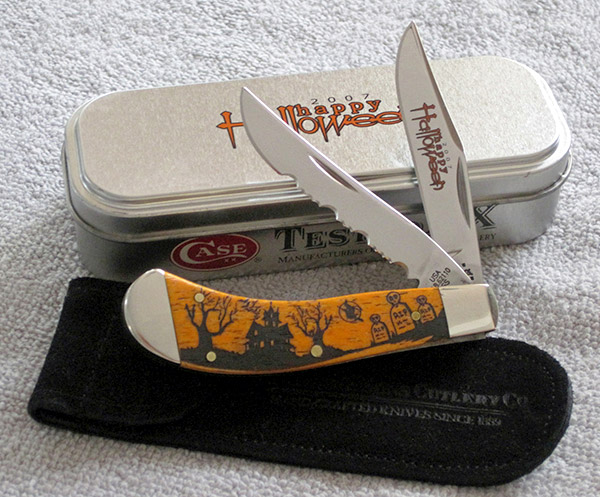 Small saddlehorn called the "Pumpkin Carver". Has orange persimmon smooth bone handles with a Halloween scene laser design and no shield. The first skinner blade is serrated. Comes in a silver tin that says 2007 in black and then says "happy _ Halloween" in orange. There is also a black suede carrying pouch. Unconfirmed report that 350 pieces were made.