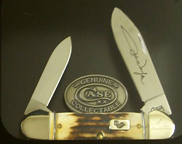 John Wayne canoe display with stag handles and stainless blades. Has the "D SS" rectangular shield. The master blade has a John Wayne signature. Comes in a wooden shadow box with a Case Collectible medallion. Shown in the 2008 Winter promotional products catalog.
