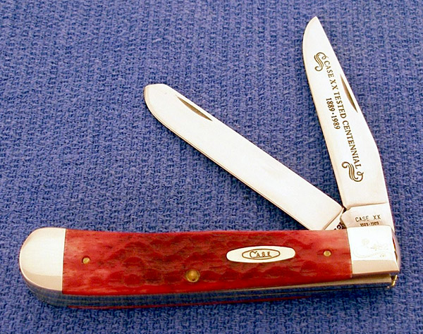 Trapper from the Case Centennial mint set of 100 knives. Shown in 1989 catalog for the 100th Anniversary of Case knives. Distinguished from the 3000 regular Centennial set knives like this by the long tailed C "Case _ xx" serial number on the right front bolster. Blade work says "CASE XX TESTED CENTENNIAL _ 1889 * 1989" in dark letters. Scrolls on both ends of the text. Has dark red standard jigged bone handles and a double oval "Case" straight long tailed C shield. Originally came in a folding knife pak and 500 sets were made.