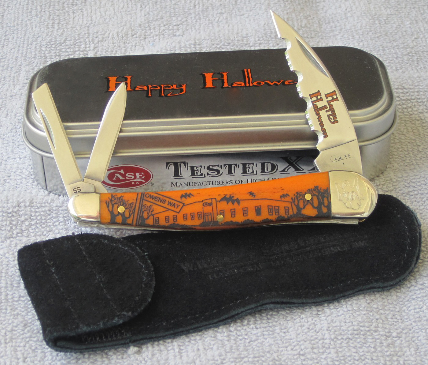 Large Halloween "Pumpkin Carver" seahorse whittler shown in 2009 Spring promotional products catalog and described as new for the year. Has persimmon orange laser design bone handles. No shield. The handle says "OWENS WAY" on a road sign and shows the Case factory with some bats. The blade says "Happy _ Halloween" in orange and black letters. There is a ghost "09" scroll on the right front bolster. This is a pre-order item. Only the quantity ordered was made. Came in a silver tin that says "Happy Halloween" in the same orange and black color scheme.
