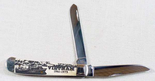 Vietnam trapper has smooth white bone laser cut front handle that says "VIETNAM _ 1961 - 1975". There is also a river gun boat on the front of the handle. The American flag shield is on the back side where the handles are smooth red bone.