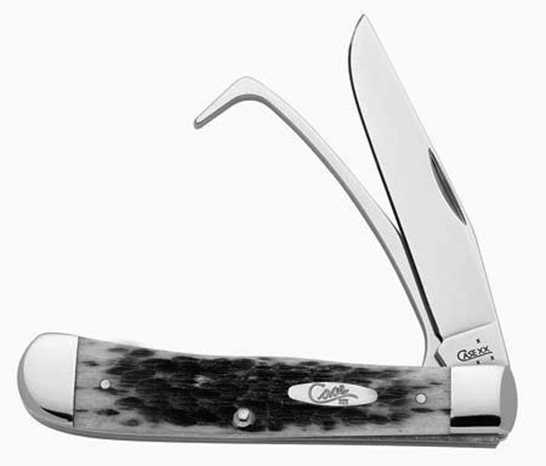 Hoof Pick trapper with amber peach seed jigged bone handles and a single oval "Case _ xx" long tail C script shield. The second blade is a hoof pick.