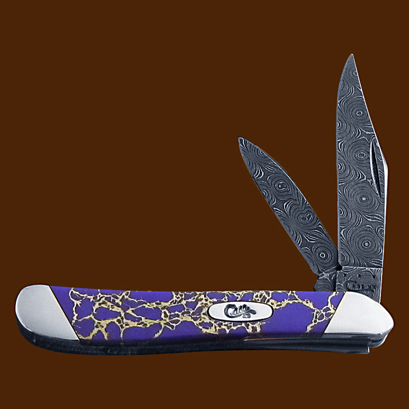Damascus peanut with purple sugalite handles and a single oval "Case _ xx" long tail C script shield. Devin Thomas raindrop Damascus. Slanted bolsters.