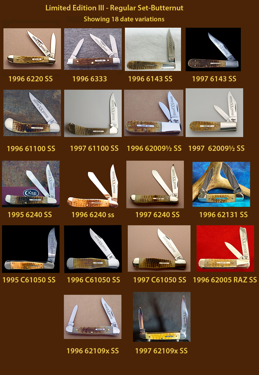 Limited Edition III regular set was made with butternut Rogers Bone handles  and released in 1997.  To date, the BladeMaster has documented 18 different year stamp variations.  Here they are…