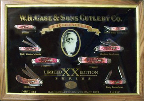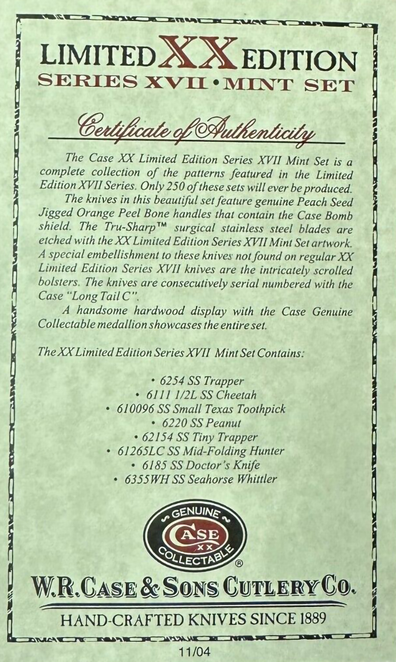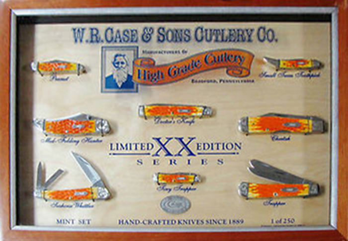 I have currently documented 18 pocket knife sets from 2005. Eleven of the sets are deluxe versions with scrolled bolsters. An eight knife deluxe set from 2005 would probably sell for $1,000 to $1,600 in 2025. The deluxe sets from 2005 include 4 volumes of the Encyclopedia set, Limited Editions XVII and XVIII, a Kentucky Bluegrass Circle C mint set, the 25th Anniversary Case Clubs set, a C. Platts set, and a Sturm, Ruger set, Note: the Case factory will frequently make a set with more than one tang stamp date on the knives. In this case, the set will show up on more than one year search.
