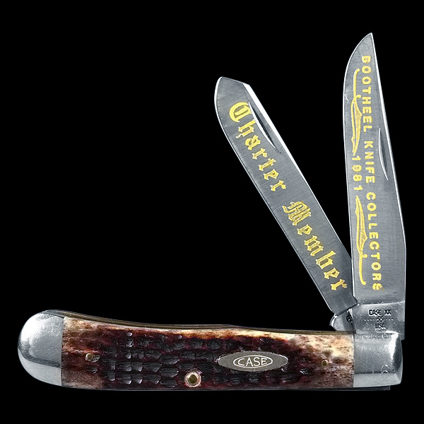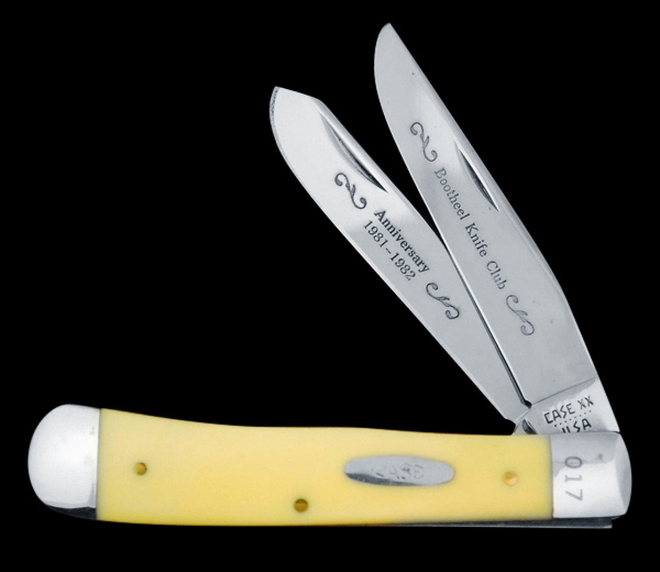 The small Boothill Knife Club has only created two knives and done them both between 1981 and 1982.  Very little information is available on this club.  And I could find no quantity information on numbers made.  These knives are hard to find, which implies very limited production.  Further,  I have seen 4 diffeent 3254’s from this club, and the highest serial number seen so far is #19.   There is a bone handle charter member knife, and a yellow composition trapper followed it.  This club probably was created in Missouri, but  the evidence for this is sketchy.    Here are both rare knives.