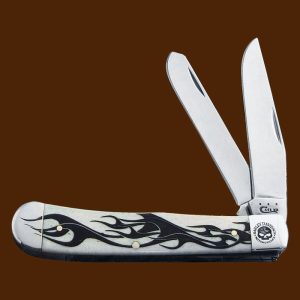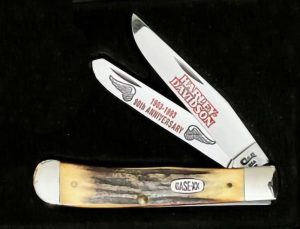 I currently have documented 84 Case xx pocket knives commemorating the Harley Davidson Motorcycle company. The first is a 3240 with gold tone shield from 1989. 1993 was the 90th anniversary +of the motorcycle company and several variations were made for the 90th. Interestingly there is a trapper with a 1998 tang stamp date and blade work from the 90th anniversary in 1993. To see all the Harley-Davidson commemoratives, go to KnifeDB.com and type “Harley” in the Remarks field on the Knife Search page. Or you can click Harley Davidson in the Brand drop down box. Suggest you click the Year sort above the listed knives. As you look at the knives, notice the continuous advancements in knife making techniques adopted by the factory to make more and more sophisticated commemoratives. Laser carved handles is and more intricate blade work are examples. Also note that I show a Gary Harbour scrimshaw from Christmas 2012. It shows a 1948 Harley. Only 12 copies were made by the artist.
