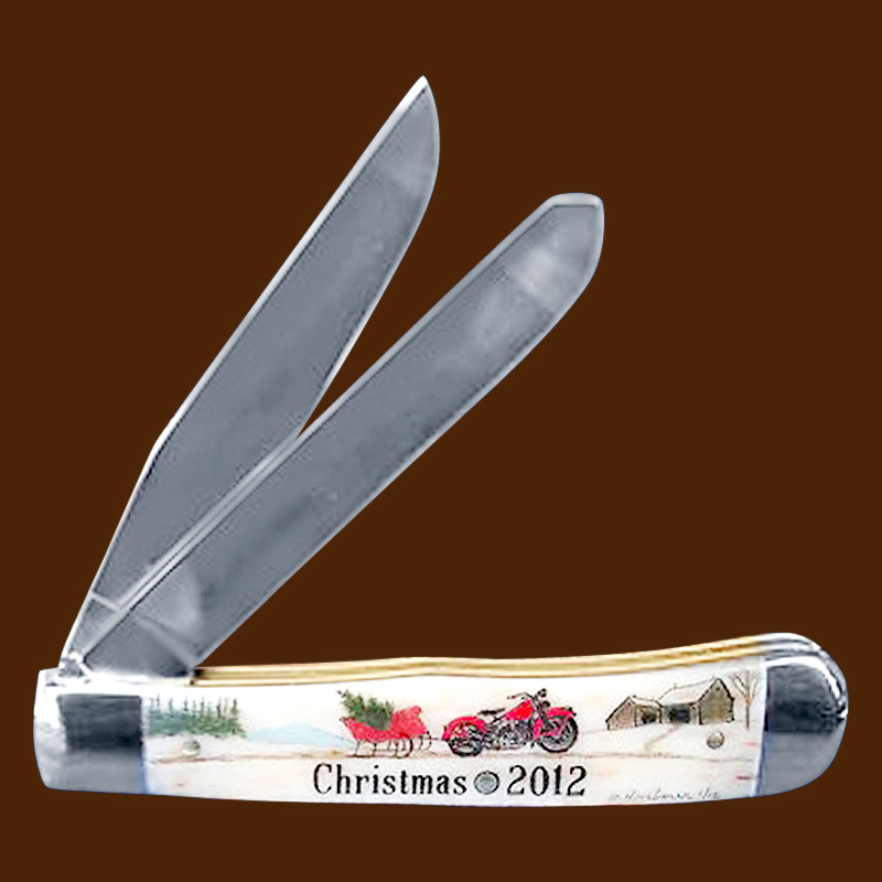 I currently have documented 84 Case xx pocket knives commemorating the Harley Davidson Motorcycle company. The first is a 3240 with gold tone shield from 1989. 1993 was the 90th anniversary +of the motorcycle company and several variations were made for the 90th. Interestingly there is a trapper with a 1998 tang stamp date and blade work from the 90th anniversary in 1993. To see all the Harley-Davidson commemoratives, go to KnifeDB.com and type “Harley” in the Remarks field on the Knife Search page. Or you can click Harley Davidson in the Brand drop down box. Suggest you click the Year sort above the listed knives. As you look at the knives, notice the continuous advancements in knife making techniques adopted by the factory to make more and more sophisticated commemoratives. Laser carved handles is and more intricate blade work are examples. Also note that I show a Gary Harbour scrimshaw from Christmas 2012. It shows a 1948 Harley. Only 12 copies were made by the artist.