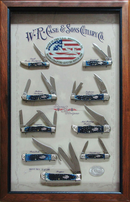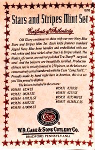 July 4th seems like the perfect time for this Case XX stars and stripes . It was made in 2003 but a couple of the knives can be found with 2004 dates. The handles are standard jigged navy blue bone with an oval Case American Flag shield. 250 sets were made. I have only found 1 selling price for the set. It sold in 2012 for $750. God bless American workmanship and creativity.