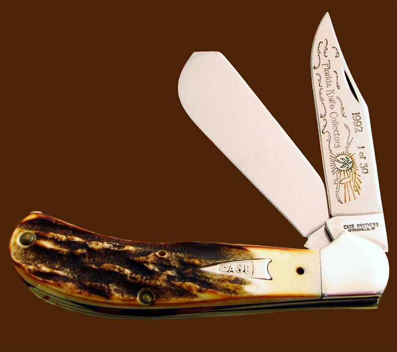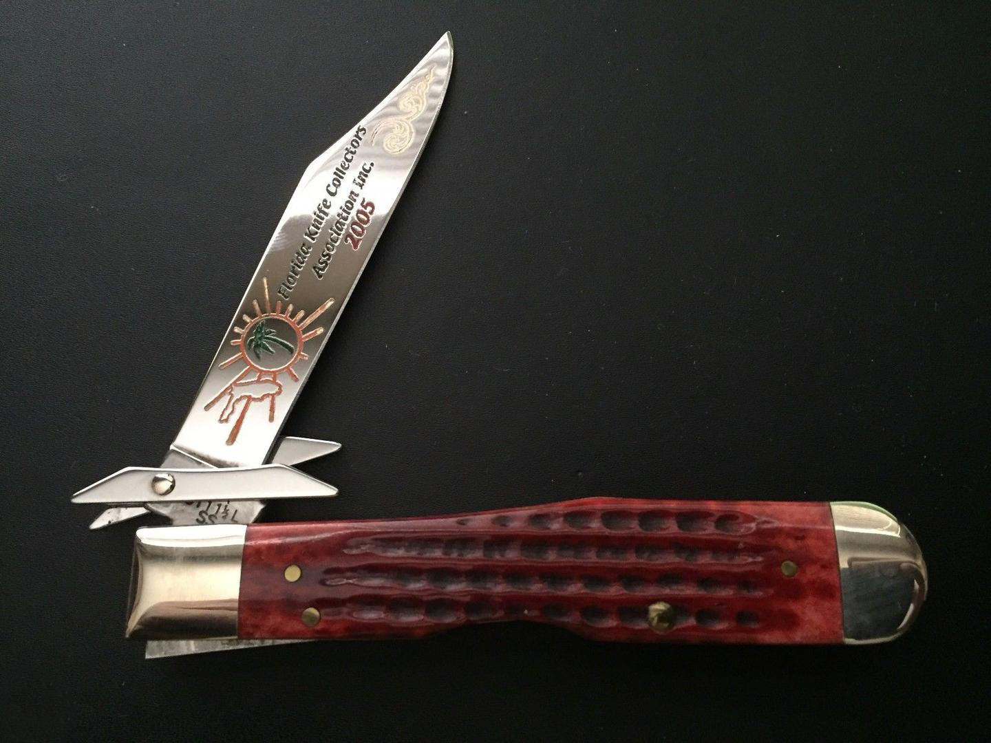 The Florida Knife Collectors Association commissioned its first Case xx knife in 1989.   KnifeDB.com has documented 5 knives for this club, with the last one from 2005.  All 5 knives were made in very limited quantities–the highest edition had 40 knives, and the lowest only 20.    Here are some of the club beauties, showing the club logo of a palm tree against the sun.