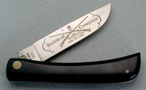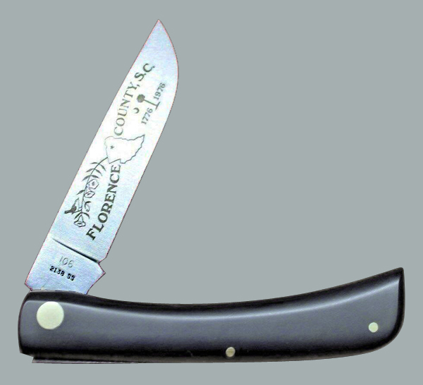 The factory made a unique Revolutionary war Sod Buster for every county in South Carolina. There are 46 of these counties. They also created unique knives for each battle in South Carolina. These knives were sold In J.C. Penny stores near the county described on the knife, but only 200 copies of each knife was made. This was a very small quantity for a knife at this time. Since they were sold in different stores it would have been very difficult to buy a whole set. And today it would be even more difficult to collect the whole set of fifty plus Sod Busters. I have shown one county knife and one battle in the samples below. Several Shaw-Liebowitz custom knives were also made to honor the revolution. One of these is shown.