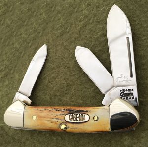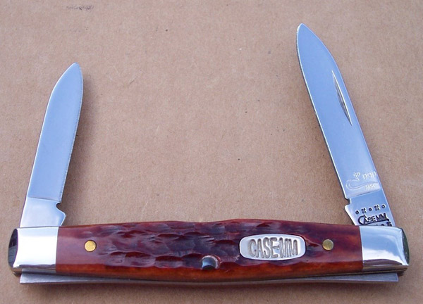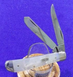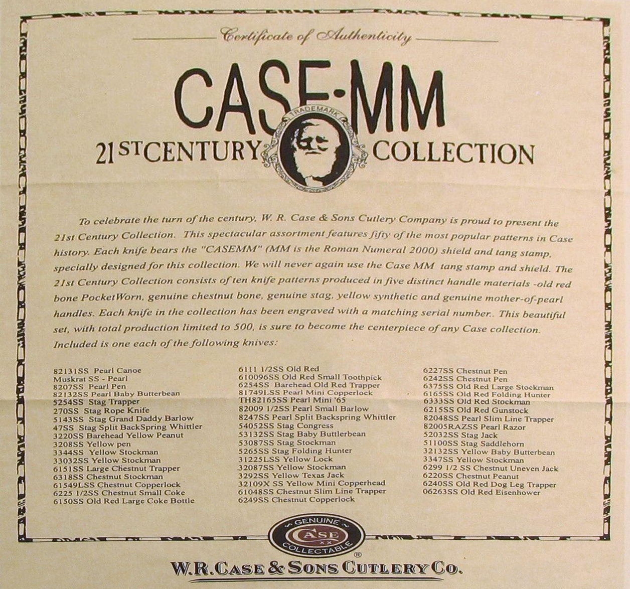 The Case Millennium set is also sometimes called the 21st Century set. The knives all have the Millennium (MM) shield and a long tailed C Millennium serial number. The COA says that Case chose ten popular patterns and each of these was made with 5 different handles. This does not appear to be what actually happened, as the COA then lists 41 different pattern numbers, not ten. 500 copies were made of each knife. The handles were Old Red pocket worn jigged bone, chestnut jigged bone, stag, mother-of-pearl and yellow composition. Came in a brief case folding knife pack. Inside there is a label for each knife. Also one knife (large coke bottle) found with a 1999 date tang stamp. May be more.