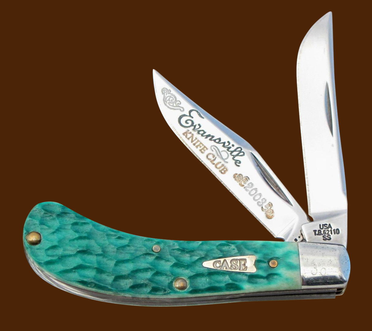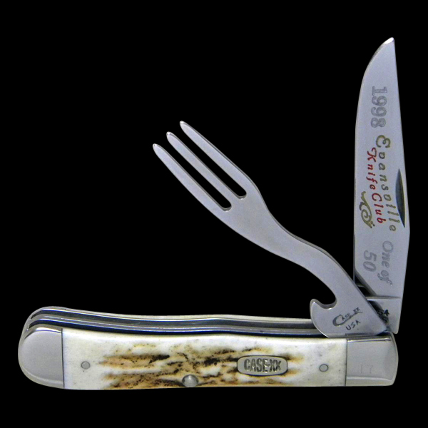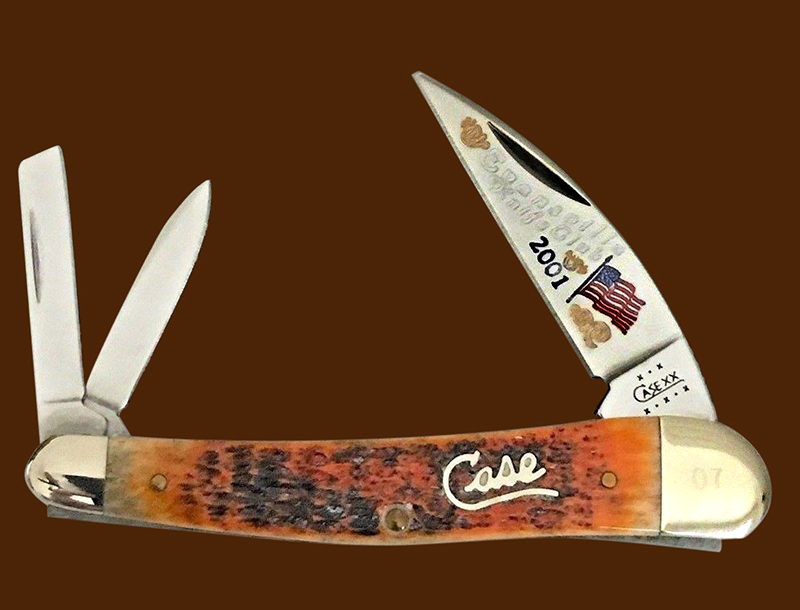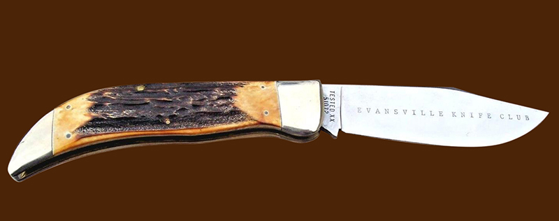 The Evansville Knife club had a long life and ordered many Case xx knives. The first knife had a club date of 1984 with a tang date of 1981. I have found and documented 17 more. The knives all were made in small quantities with 150 pieces being the largest edition and 35 the smallest. Most editions were between 50 and 100 knives. Many of these knives were especially beautiful. Beauty and rarity are two essential ingredients in rising future value. Here’s some of the club knives to enjoy. Notice the Autumn handled seahorse whittler below. The American flag tells us that this one was made shortly after the twin towers terrorist attack.