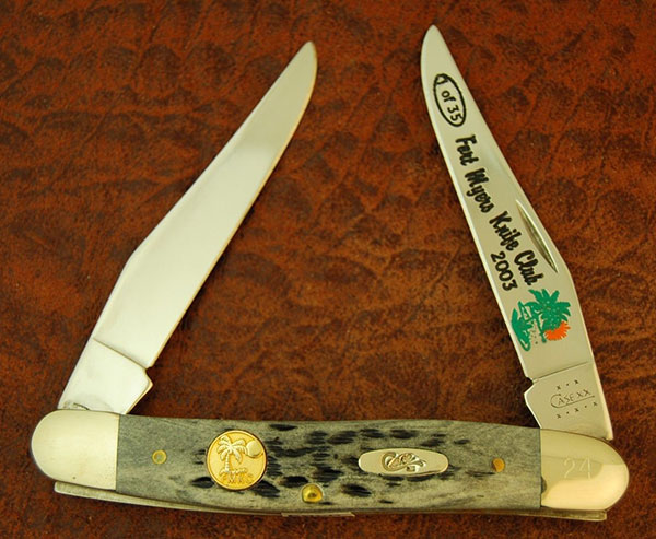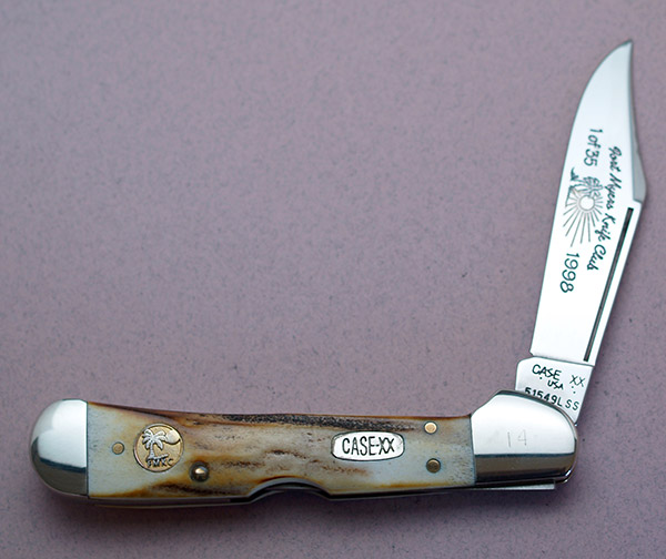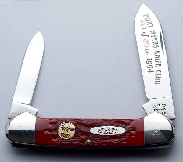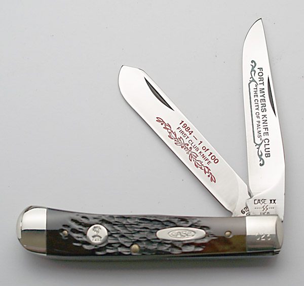 The Fort Myers Knife Club has created 21 Case knives. The first knife was from 1984. The last knife was from 2006. The earlier editions were larger, but still made in less that 150 pieces. The editions became smaller over time, with some editions having around 30 knives. There are two knife show knives in undetermined quantities. Two interesting club years; The 1984 1985 stag trapper has two variations-a Cc stamp with 6254 and a regular correct 5254; the other is the 1992-93 red bone trapper. Only 40 were made but two tang stamp variations have appeared within the 40–a DR254, and a DR6254.
